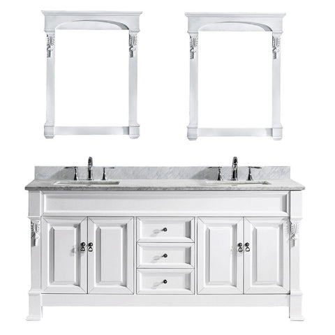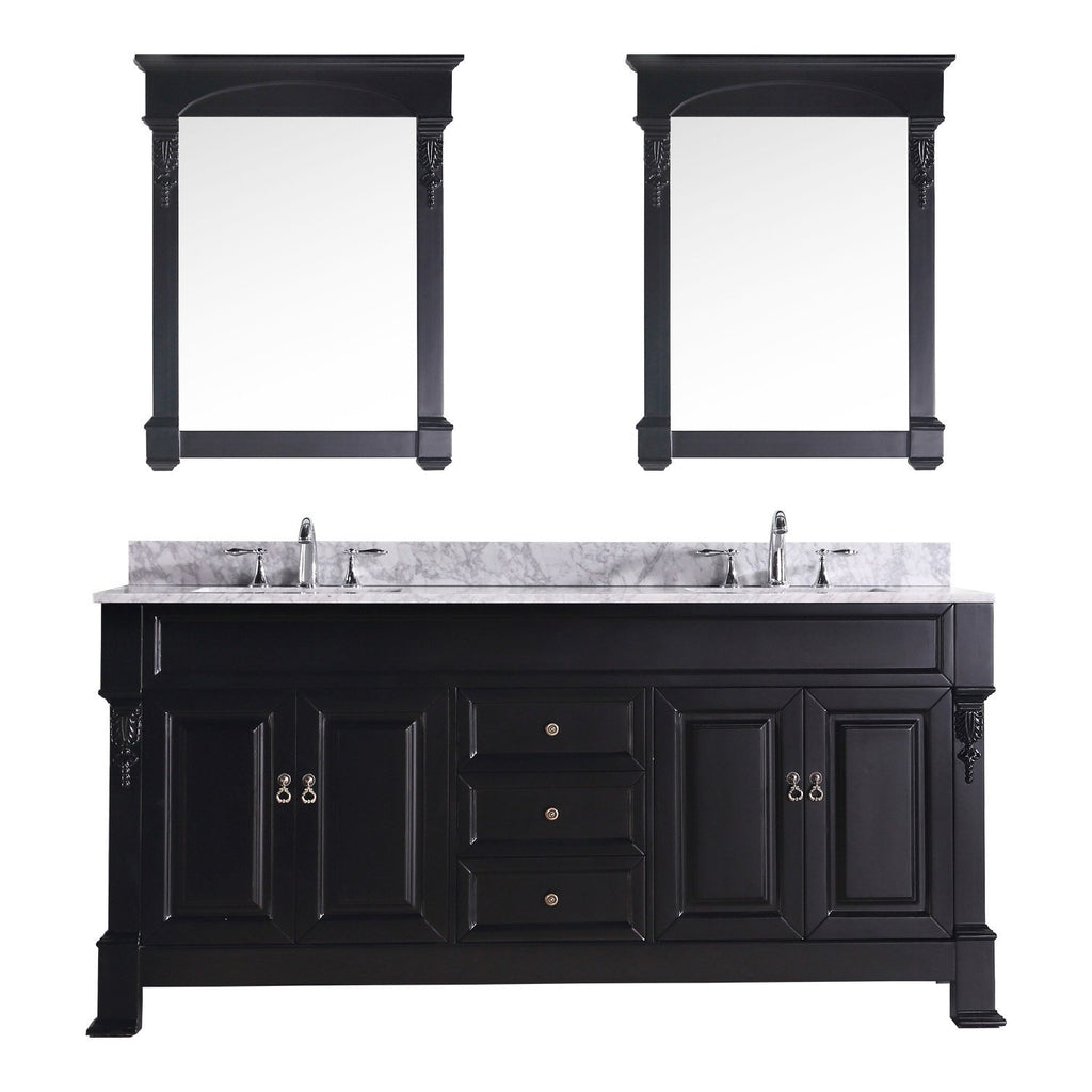 Details of the Huntshire 72" Double Bathroom Vanity in Dark Walnut with Marble Top and Round Sink with Mirrors