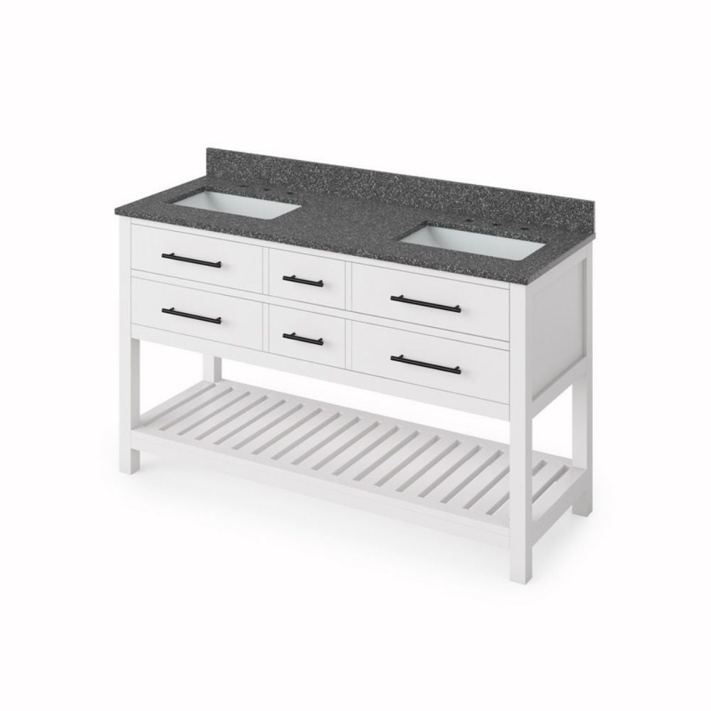 Details of the 60" White Wavecrest Vanity, double bowl, Boulder Cultured Marble Vanity Top, two undermount rectangle bowls by Jeffrey Alexander | VKITWAV60WHBOR